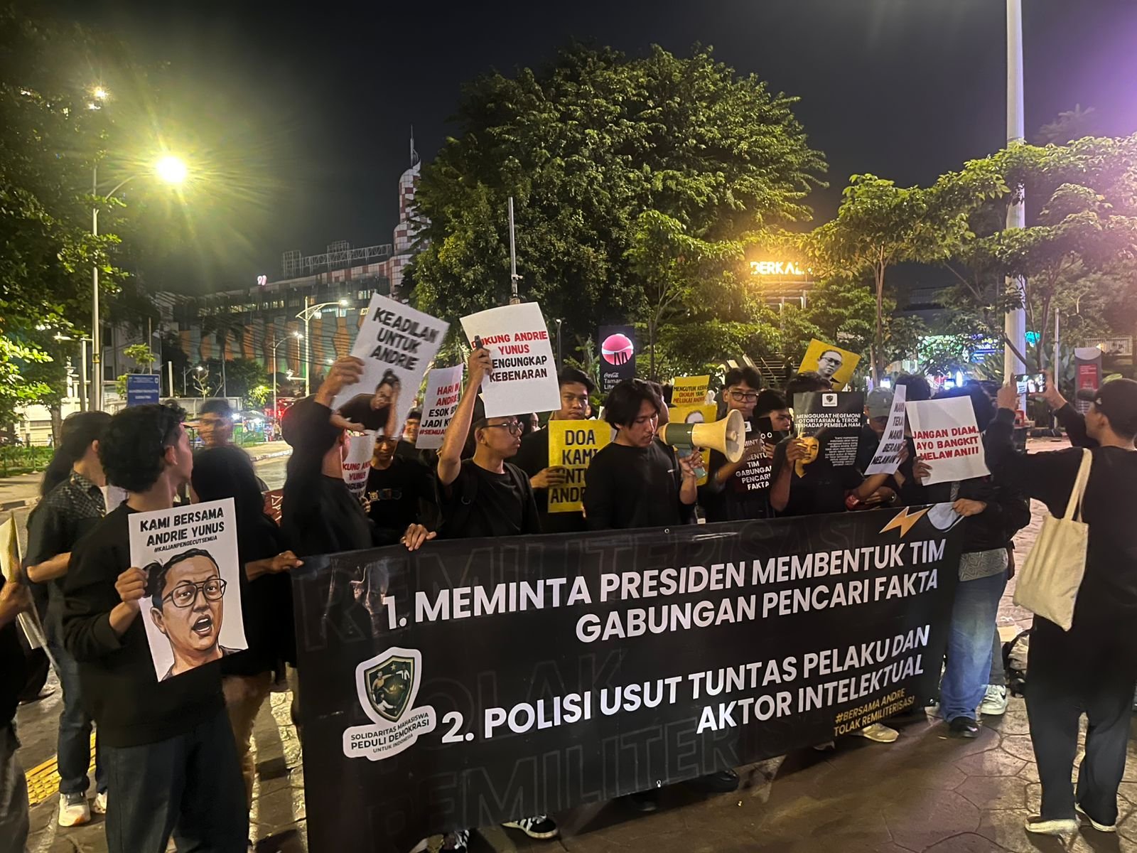 Aksi solidaritas tersebut diwarnai dengan pembentangan poster dan seruan tagar seperti #KeadilanUntukAndrie dan #TolakRemiliterisasi. Mereka juga menyatakan akan terus mengawal kasus ini hingga pelaku serta pihak yang diduga menjadi dalang di balik serangan terhadap Andrie Yunus diungkap dan diproses secara hukum.